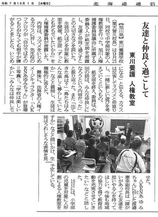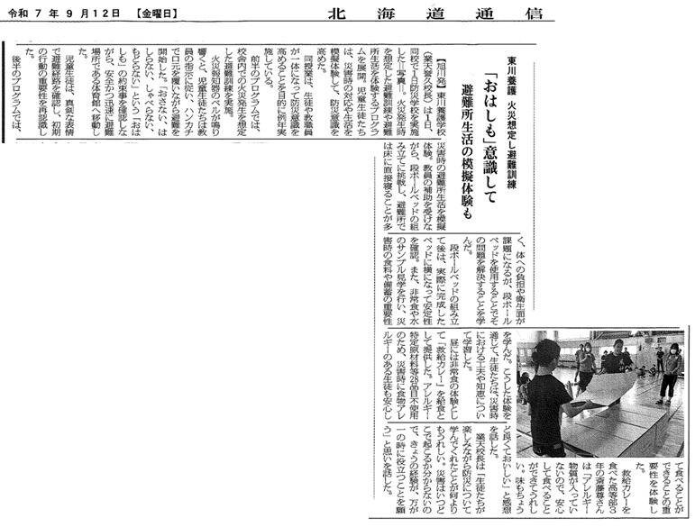 一日防災学校と人権教室の様子が、北海道通信日刊教育版に掲載されました。